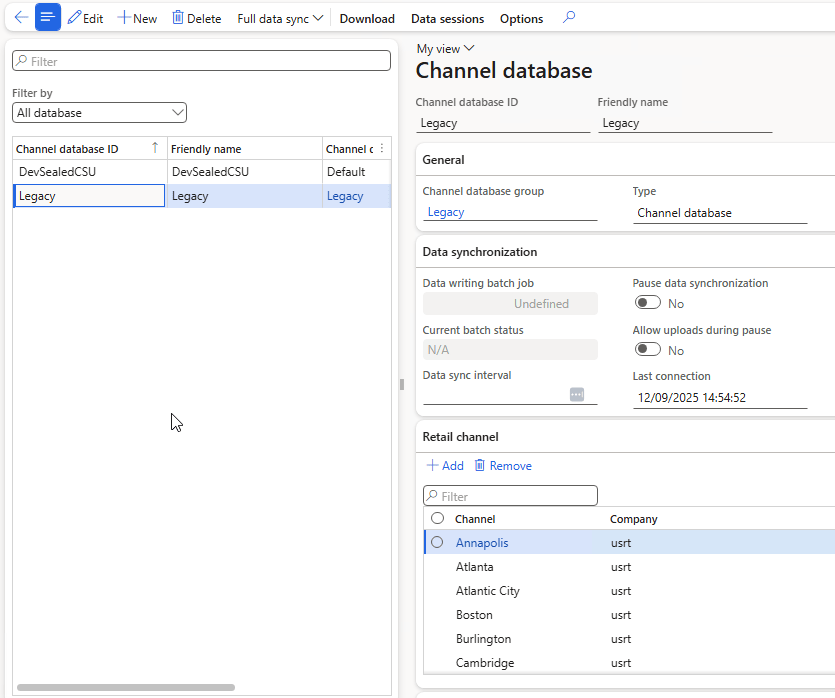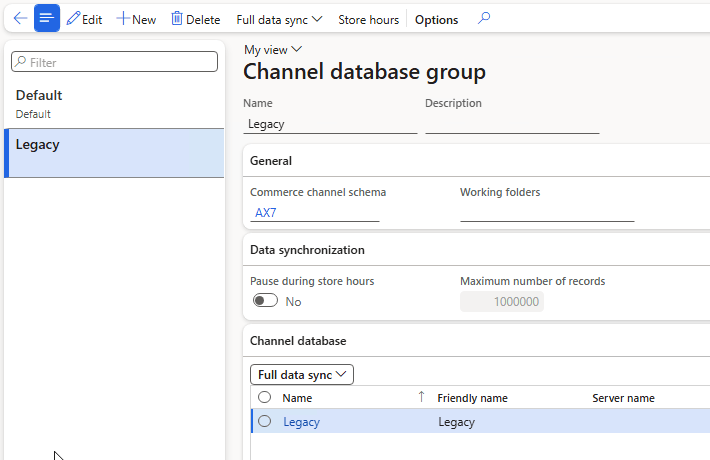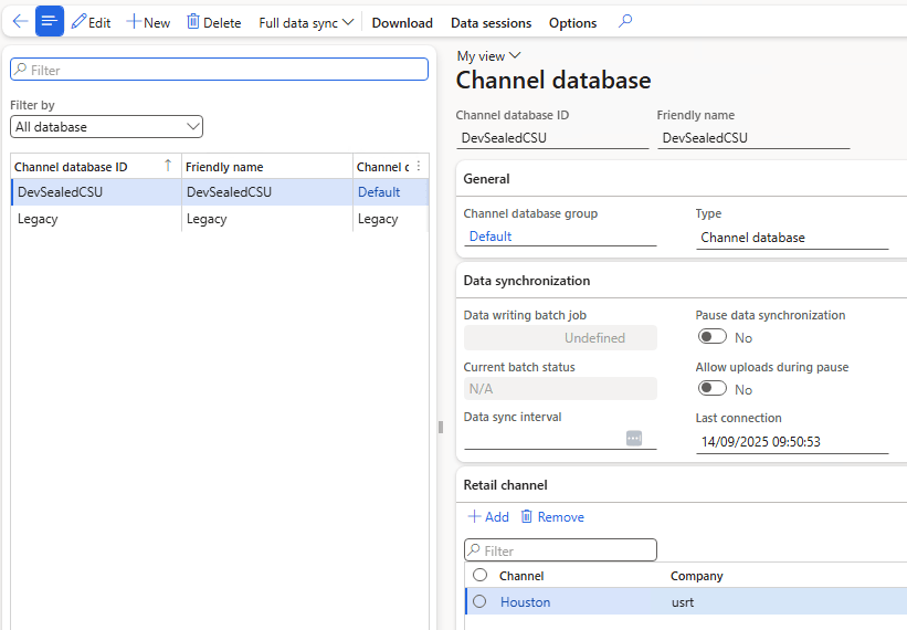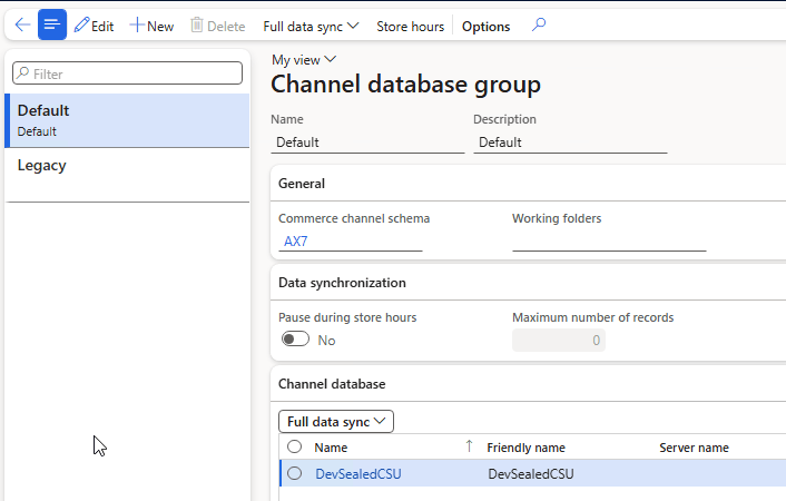 Steps 2 and 3 result in a single Store in the Default channel database group (all stores other than Houston are in the Legacy channel database group.)